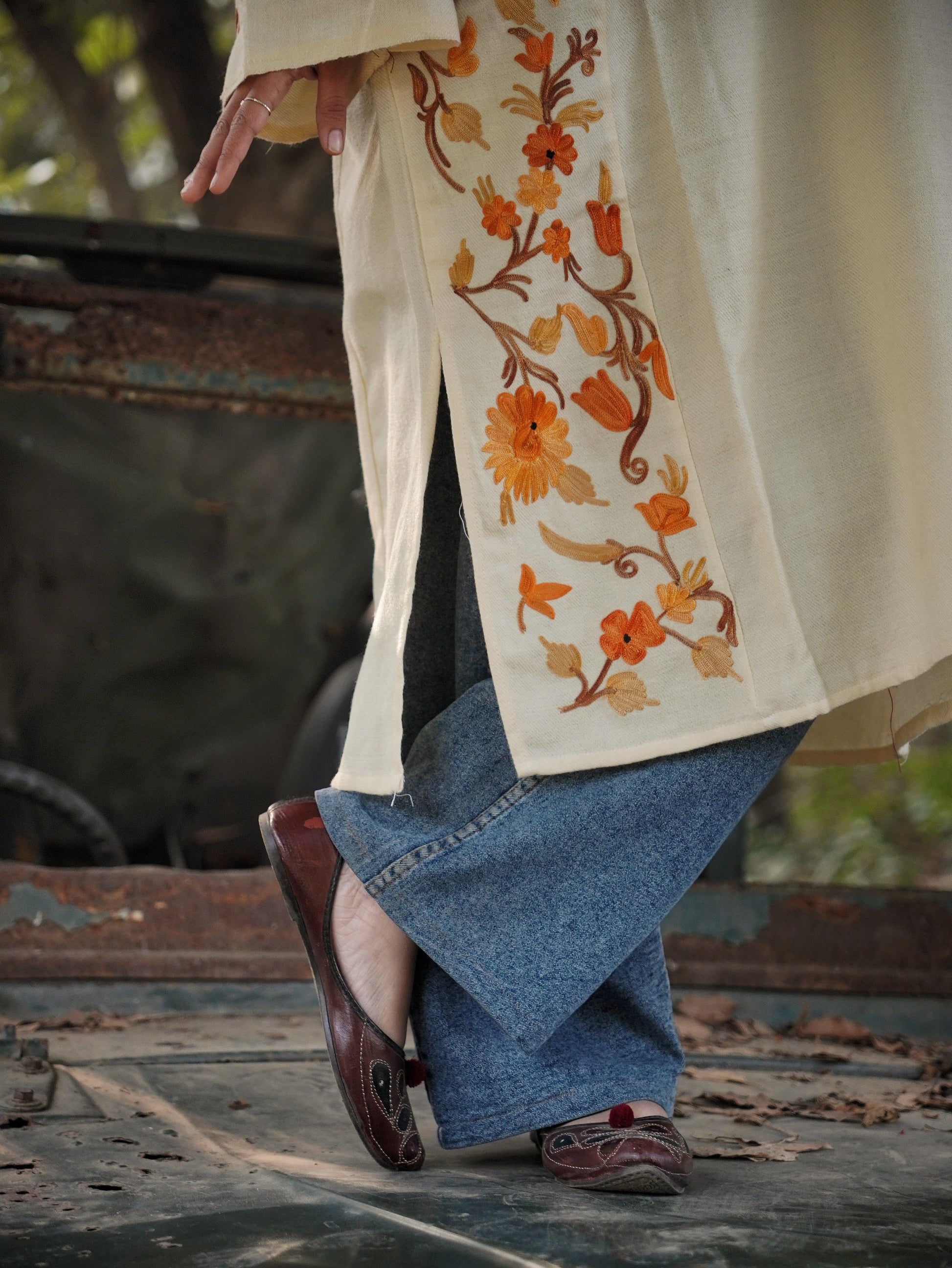 Embroidery:Detailed Kashmiri Aari embroidery with intricate floral designs.